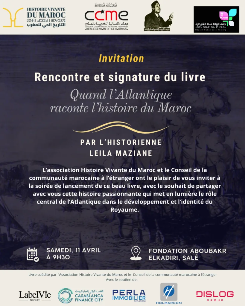L’Association Histoire Vivante du Maroc, le Conseil de la communauté marocaine à l’étranger (CCME) et la Fondation Abou Bakr El Kadiri organisent une rencontre-signature autour du beau livre « Quand l’Atlantique raconte l’histoire du Maroc », le samedi 11 avril 2026 à 9h30 au siège de la Fondation à Salé.